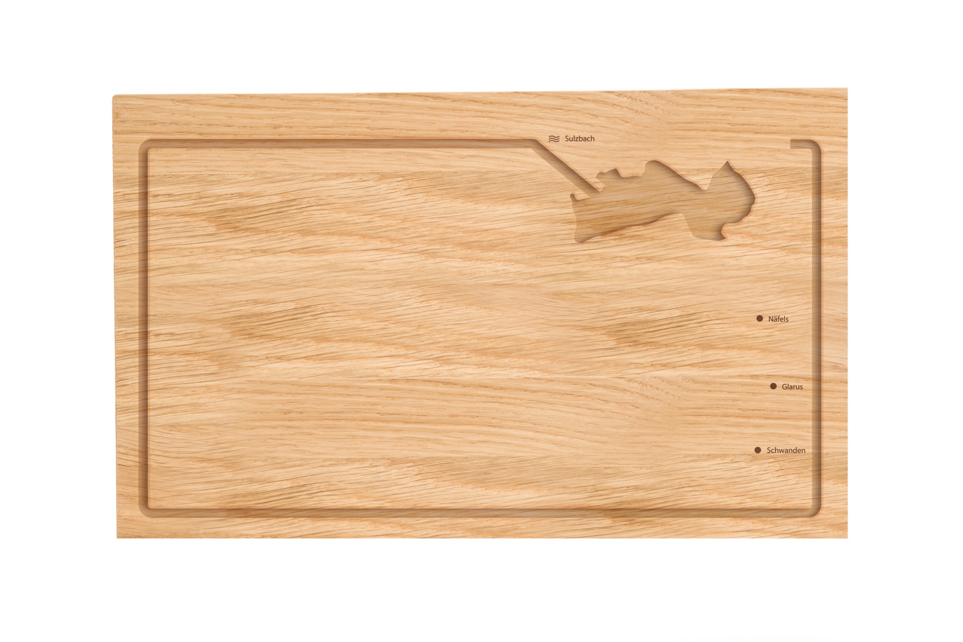 Ein ganz neues Produkt, in Zusammenarbeit mit PanoramaKnife, sind die neuen Schneidbretter, bei denen die Saftrille die Umrisse von Glarner Seen sind. Drei Bretter sind speziell auf die Glarner Messe hin entworfen worden mit den Seen: Klöntalersee, Obersee und mit dem Walensee.